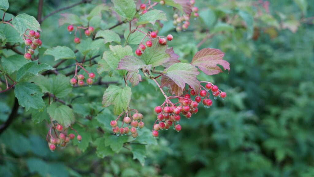 Калина обыкновенная (Viburnum opulus) известна своей привлекательной формой и насыщенными цветами. Весной она радует белоснежными соцветиями, летом — густой зеленью, а осенью — ярко-красными ягодами и красочными листьями. Этот кустарник хорошо переносит холодные зимы и не требует сложного ухода, что делает его отличным выбором для средней полосы России.