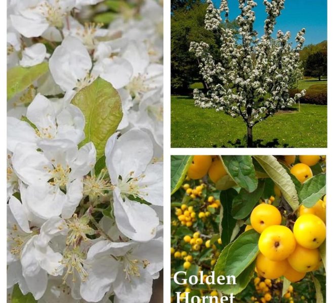Яблоня Голден Хорнет — удивительной красоты дерево, которое, в отличие большинства своих собратьев, привлекательнее всего не только весной, когда все вокруг распускается и зеленеет, но и зимой, до прихода суровых морозов, все благодаря необычным желтым плодам этого сорта. Крона у Яблони Голден Хорнет неплотная, с листиками нежного зеленого цвета, которые после прихода холодов становятся практически красными.