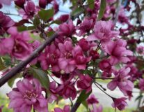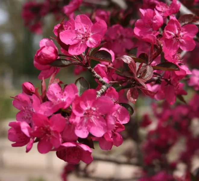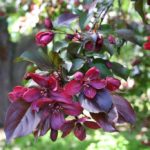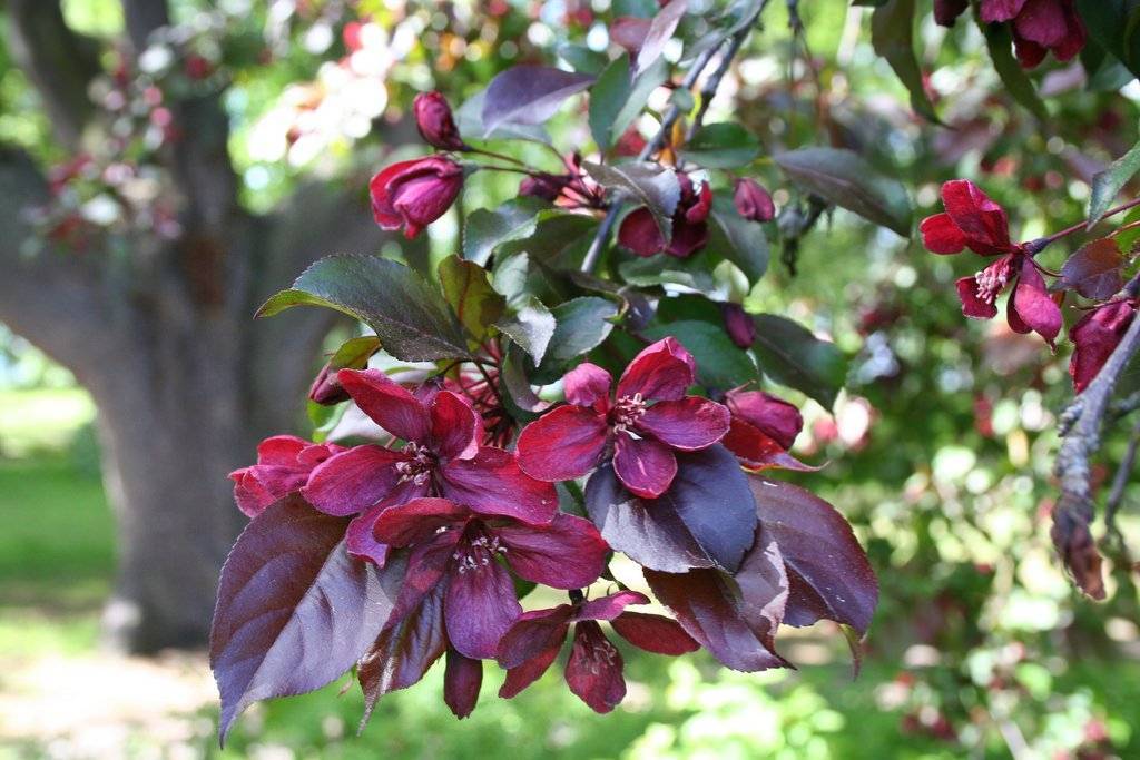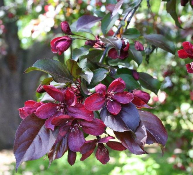 Описание листьев и цветов: листовые пластинки продолговатые, с глянцевой поверхностью, слегка зауженные, размером 8-10 см. Их окрас изменяется в период вегетации. Также пурпурные и темно-фиолетовые листья меняют цвет от выгорания на солнце и становятся более красными. Ближе к осени становятся багряными или красно-коричневыми. Листья опадают поздно, поэтому растение долго украшает ландшафт. Цветы яркие, насыщенной малиново-пурпурной окраски, плотно покрывают ветви. Период цветения яблони начинается в начале мая и длится около двух недель.