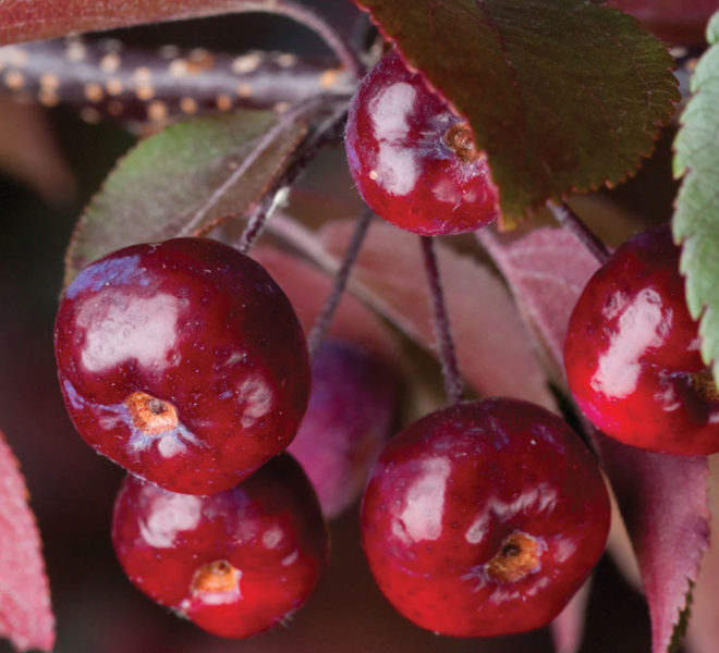 Описание плодов: плодоношение начинается на 3-4 год после высадки карликового сорта. Плоды мелкие и одиночные, размером с вишню, округлой и слегка вытянутой формы. Имеют красную или пурпурного цвета кожицу с восковым налетом. Для питания плоды не пригодны, имеют горький вкус и могут вызвать аллергию. Плоды не опадают зимой, а служат подкормкой для птиц.