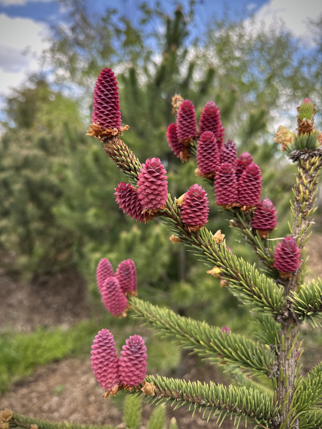 Ель обыкновенная Акрокона обладает уникальной, густой, короткой и жесткой хвоей длиной 1-1,5 см, окрашенной в насыщенный темно-зеленый цвет. Однако главное украшение этого сорта – не хвоя, а огромное количество крупных, декоративных шишек, которые появляются уже на молодых растениях. Многочисленные шишки покрывают все дерево, но особенно эффектно смотрятся на концах ветвей. В молодом состоянии они ярко-пурпурные или малиново-красные, позже становятся светло-коричневыми, достигая длины 5-8 см. Эта смена окраски в течение сезона делает растение невероятно нарядным с весны до осени. Обладает приятным, хвойным ароматом.