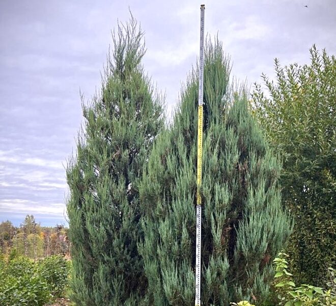 Можжевельник Блю Эрроу (в переводе — «Голубая стрела») получил своё название благодаря строгой вертикальной форме и выразительной окраске. Он вырастает до 2,5–3 метров в высоту при ширине кроны до 0,5 метра, благодаря чему идеально подходит для озеленения небольших участков, создания живых изгородей, аллей, а также в качестве солитера.