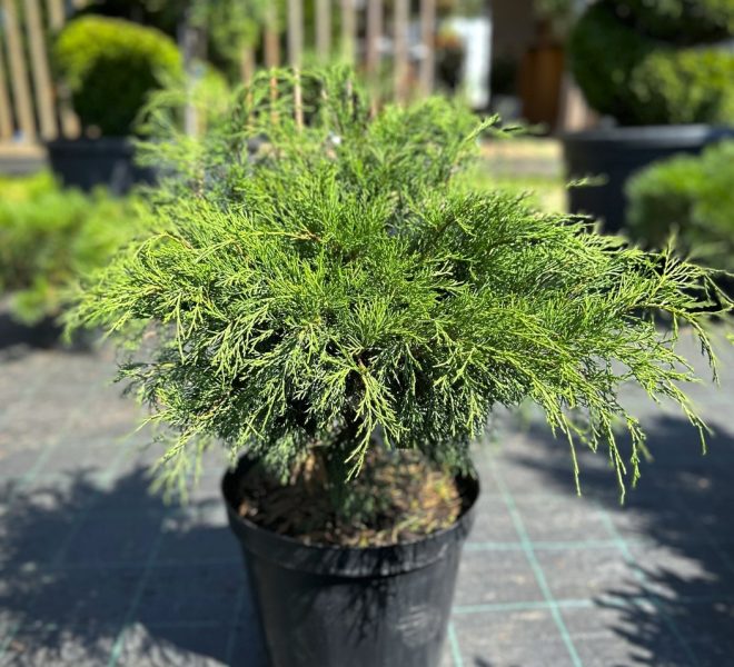 Растение медленно взрослеет, за год примерно на 30 сантиметров в высоту и на 15 сантиметров в диаметре. Хвоя растения имеет короткие иголки с острыми концами, светлого зеленого оттенка с синим отблеском. Растение также имеет шишки, они круглой формы и в диаметре занимают чуть меньше сантиметра. Оттенок шишек при появлении зеленый, но позже они становятся голубоватыми с сизым налетом. Посадка растения не обуславливается подбором почвы, так как растение не особо требовательно к ней. Можжевельник хорошо растет в каменистых почвах и в сухих. Может выносить небольшое засоление. Растение устойчиво к засухе, но не переносит застоев. Данное растение достаточно устойчиво к морозам, оно выносит короткие морозы до 30 градусов.