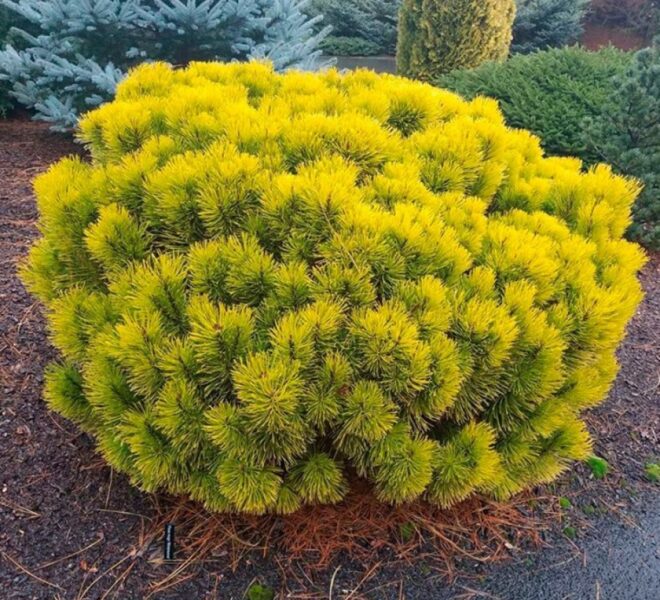 Уход за сосной горной Winter Gold не требует особых усилий. Растение предпочитает солнечные или слегка затенённые места, а также хорошо дренированную почву. Регулярный, но умеренный полив поможет сохранить здоровье хвои и предотвратить пересыхание корней. Весной рекомендуется подкормить сосну комплексными удобрениями для хвойных растений, что способствует активному росту и насыщенной окраске иголок.