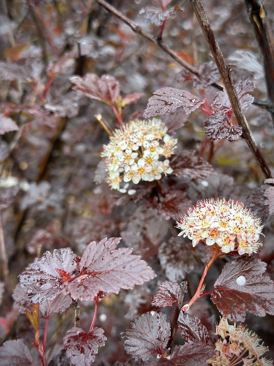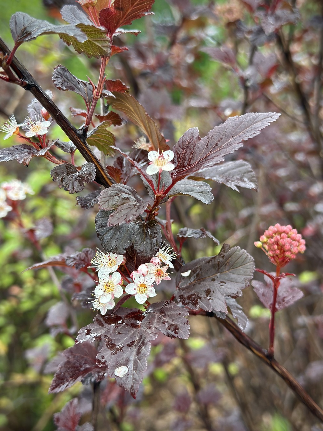 Декоративен раскидистой кроной с темно-пурпурными листьями, розовато-белыми полушаровидными соцветиями и ярко-малиновыми плодами-листовками.