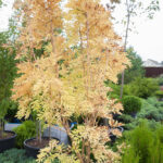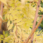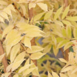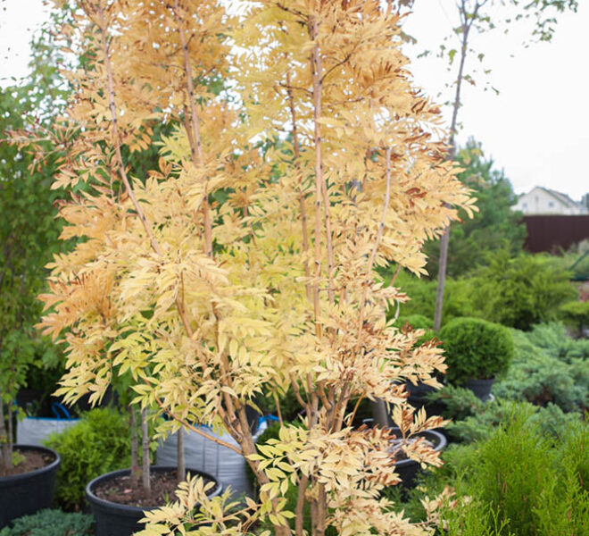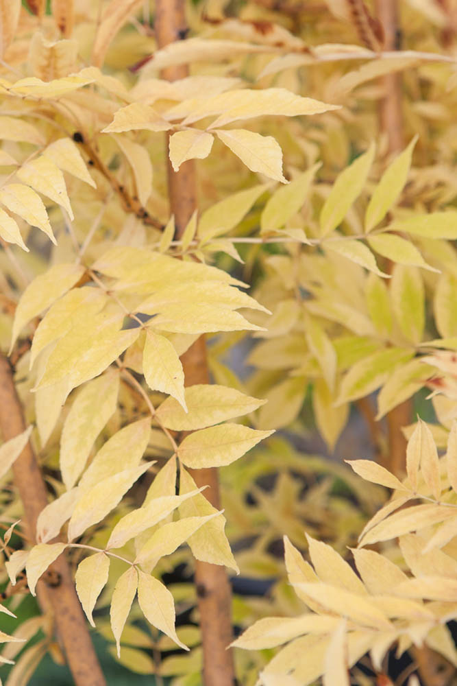 Ясень обыкновенный Ауреа (Fraxinus excelsior Aurea) – красивое дерево среднего размера с несколькими стволами в форме кустарника, по виду больше напоминающее южное растение благодаря ажурным листьям, меньшим по размеру, чем у исходного вида. Во взрослом возрасте в высоту достигает от 4 до 5 метров. Форма кроны округлая. Молодые побеги покрыты желтоватой корой довольно изящного оттенка, собственно это и делает дерево декоративным даже зимой. Листья опадающие, непарноперистые, весной салатового окраса, на протяжении лета они становятся желто-зелеными, а к осени вовсе приобретают насыщенный ярко-жёлтый цвет. Цветки без околоцветника, появляются из чёрных округлых боковых бутонов за несколько недель до распускания листьев, особой декоративности не представляют. Плоды-крылатки длиной до 5 см, часто сохраняется на ветвях в течение всей зимы. В суровые зимы часть побегов ясеня может обмерзать, но после быстро восстанавливаются. К почве требователен, недостаточно дымо- и газоустойчив. Хорошо переносит засуху, но не любит сухие почвы.