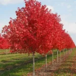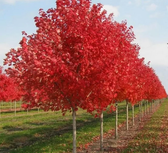 Дерево высотой до 10-15 метров (макс. до 18) и диаметром — до 6 (макс. до 10) м с правильной пирамидальной или яйцевидной формой кроны, во взрослом состоянии – с округло-раскидистой. Кора темно-серая, шелушащаяся, ветви – коричнево-красные. Листья на красных черешках, по размерам немного больше, чем у остальных культиваров клена красного, 3-5-ти лопастные, лопасти треугольные, коротко заостренные с неравными зубцами. При распускании листья красноватые, летом сверху темно-зеленые и блестящие, нижняя сторона беловато-сизая. Осенняя окраска листьев различных оттенков: от оранжево-розовой или оранжево-желтой до темно-красного с розовато-серебристой нижней стороной. Окрашивание проявляется рано. Окрашенные листья долго держатся на дереве. Осеннее окрашивание зависит от свойств почвы и погодных условий лета и осени. Цветет до распускания листьев. Цветки очень привлекательные, на длинных цветоножках, темно-красные или красновато-желтые с далеко выдающимися из околоцветника тычинками и пестиками. Незрелые крылатки красного цвета.
