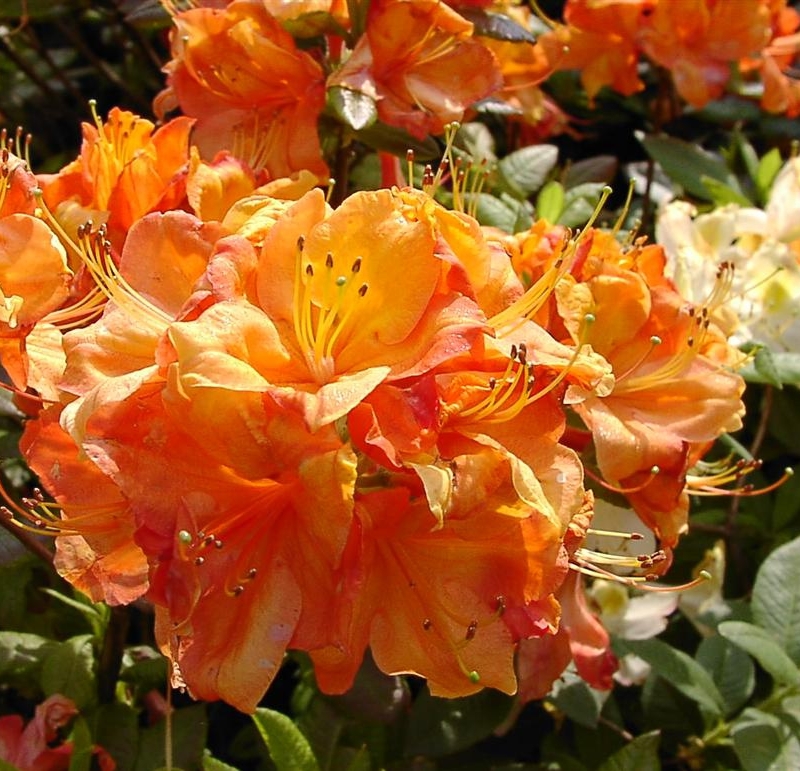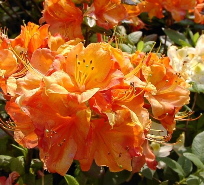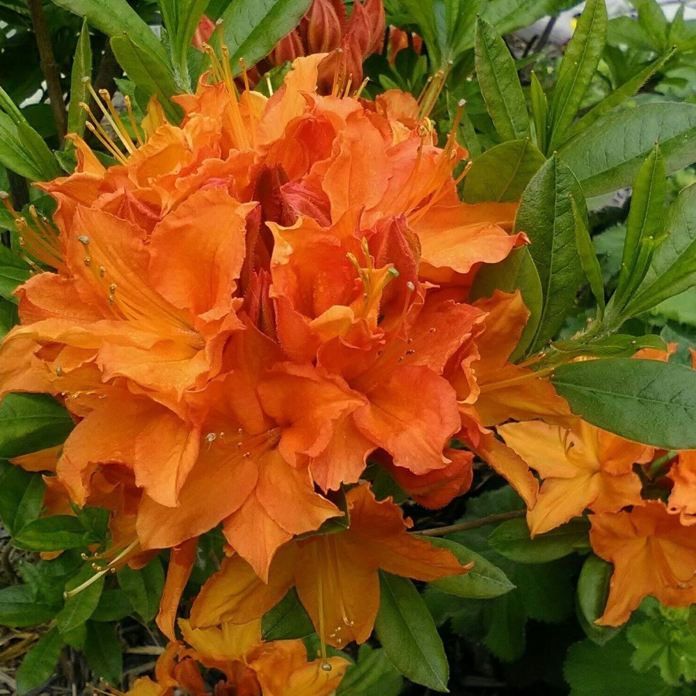 Саженцы кустарника Гловинг Эмберс (Glowing Embers) – прекрасная азалия из садовых рододендронов довольно рослая (до 2 метров) обязательно придется по душе каждому, кто ее увидит. У нее крупные (до 10 сантиметров) глянцевые листья, цветки оранжево-красные, средних размеров, объединены в соцветия по 7-14 штук. Цветет в конце весны. После отцветания все соцветья необходимо удалять, для закладывания новых почек.