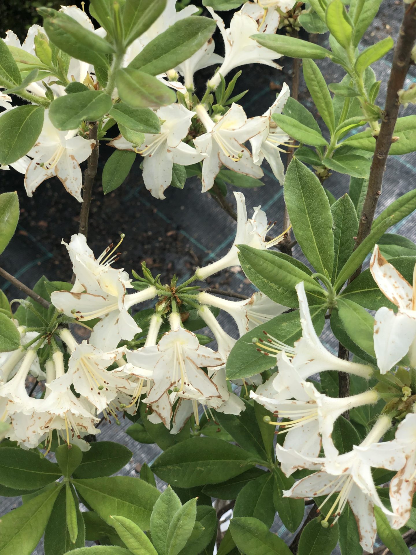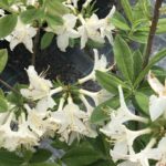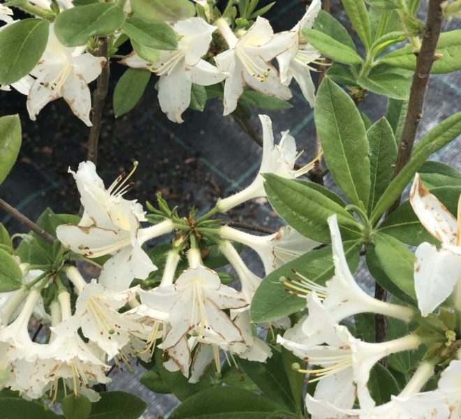 Азалия ‘Mowe’ Средний, густой, раскидистый кустарник. Высота до 1,8 метров и диаметр кроны до 1,5 метров. Листья при распускании бронзовые, потом темно-зеленые, осенью – малиново-красные, а потом желтые. Цветы бело-розовые с желтым пятном, крупные, душистые. Цветет с конца мая по июнь. Растет на солнце и в полутени. Предпочитает плодородные, влажные почвы, требует дополнительного полива и небольшого укрытия на зиму. Обрезка осуществляется раз в год сразу после цветения, удаляются отцветшие цветы и укорачиваются побеги. Используется для одиночных и групповых посадок, хорошо смотрятся рядом с хвойными растениями.