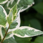 Крупная светло-зеленая листва кустарника со светлыми вкраплениями и такой же светлой каймой. Листья около 10 сантиметров в длину обладают овальной формой с острыми концами. Осенью листья приобретают яркую пурпурно-красную окраску.