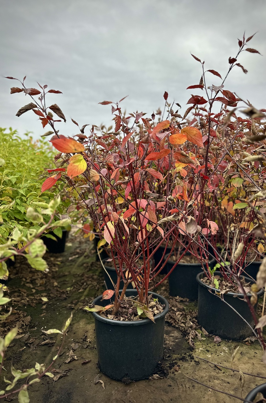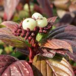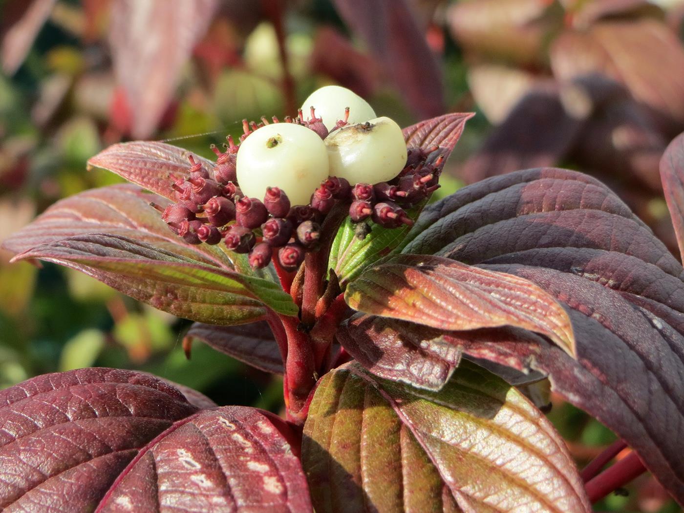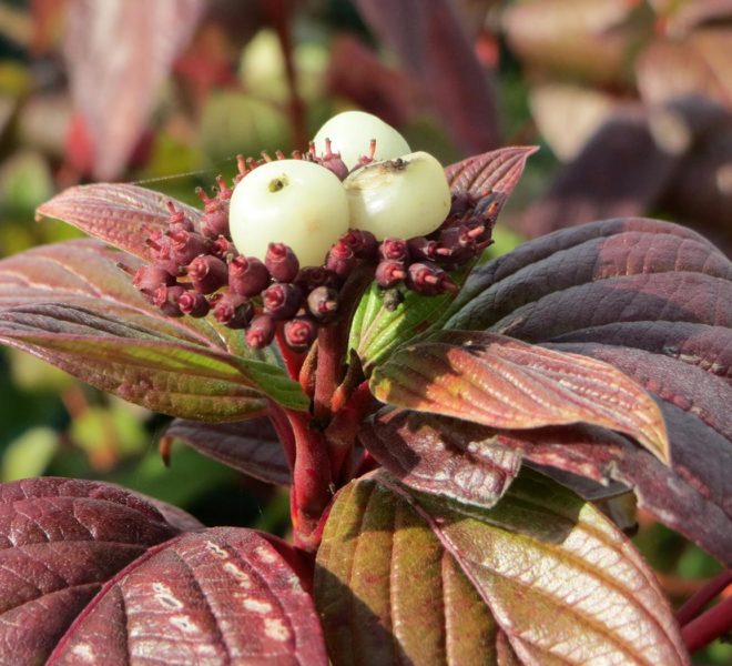 Дерен белый (Cornus alba `Kesselringii`) представляет собой быстрорастущий кустарник высотой 2-3 м, шириной кроны 3-5 м с тонкими декоративными побегами. Кора необычного, черно-пурпурного цвета. Листья широкояйцевидные, при распускании темно-коричневые, летом зелено-коричневые, несколько морщинистые, снизу сизовато-белые. Осенью окрашиваются в фиолетово-красный цвет. Очень оригинально и необычно смотрятся на их фоне белые ягоды. Цветки мелкие, белые, собраны в многочисленные щитковидные соцветия. Цветет в первой половине лета и повторно в начале осени. Плоды мелкие, круглые, ягодообразные.