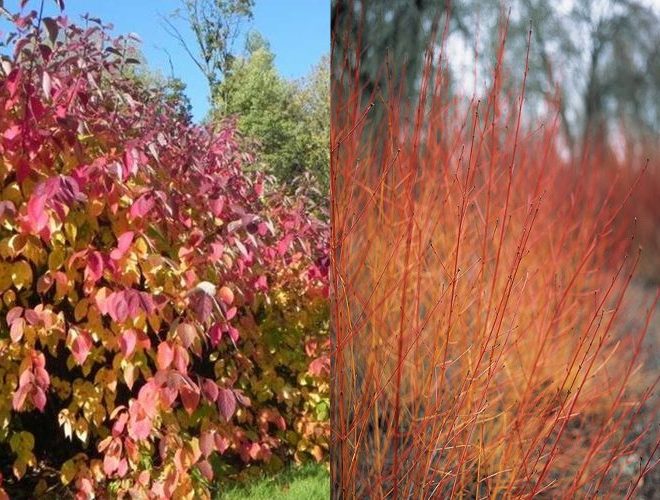 Кустарник высотой и диаметром до 1,5 метра. Побеги красно-оранжевые, особенно яркие на солнечной стороне. Листья темно-зеленые, удлиненно-овальные. Осенняя гамма от винно-красного до желто-оранжевого тонов. Цветки белые в щитковидных соцветиях. Особенно эффектен поздней осенью и ранней весной. Растет медленно.