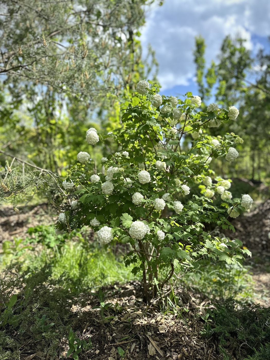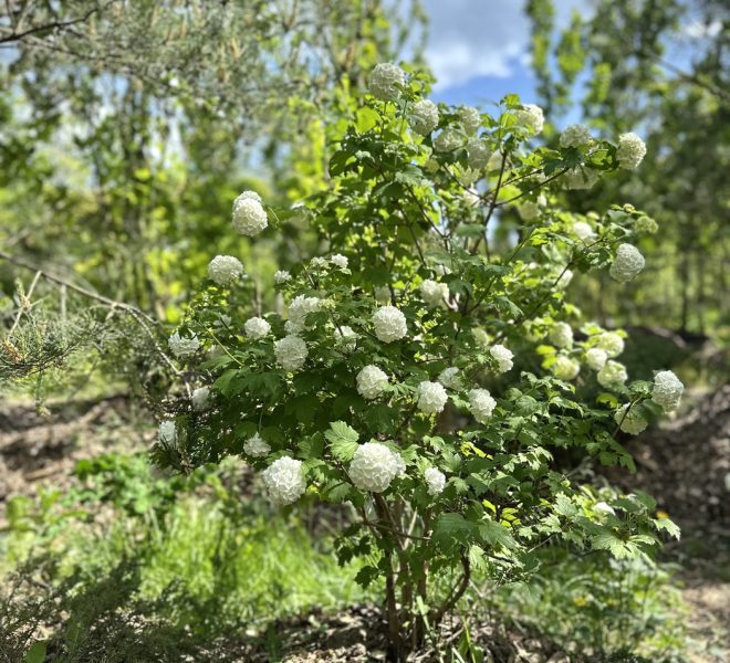 Калина обыкновенная или калина красная (Viburnum opulus) – очень декоративный листопадный кустарник с раскидистой кроной и съедобными плодами, которые могут висеть вплоть до выпадения снега. Принадлежит к семейству Адоксовые. Темп роста быстрый, за год прибавляет в высоту и ширину до 30-40 см. Максимальная высота растения около 5 м, диаметр до 4 м. Побеги широкораскидистой кроны покрыты серо-бурой корой. Листья крупнозубчатые, трех-пятилопастные, сверху темно-зеленые, снизу имеют серовато-зеленый окрас. Осенью листва меняет свой цвет на целую гамму оттенков от желто-красного до багрово-пурпурного. В мае-июне кустарник покрывается белыми, ароматными, зонтиковидными соцветиями, они располагаются на верхушках молодых побегов и придают ему декоративный вид. Плоды – красные шаровидные или овальные ягоды с крупной косточкой, собранные в большие кисти. Именно за цвет плодов растение известно также как калина красная. Калина обыкновенная обладает высокой морозостойкостью и хорошо переносит городские условия. Неприхотлива в уходе. Лучше всего развивается на освещенных солнцем участках, растет и в легкой полутени. Растение предпочитает увлажненные места, но плохо реагирует на застой воды. Весной требуется проводить санитарную обрезку, удалять сухие, мёртвые ветви и формировать красивую крону. Продолжительность жизни растения составляет примерно 50 лет.