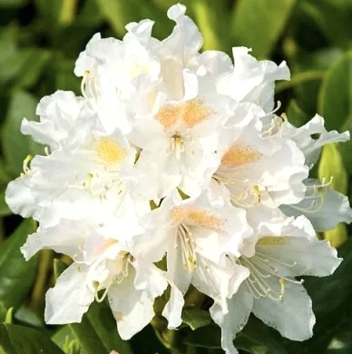 Рододендрон Каннингемс Уайт – один из самых надёжных и эффектных сортов для садов средней полосы. Это вечнозелёный кустарник с плотной кроной и крупными кожистыми листьями, который весной превращается в настоящий цветочный фонтан. Нежные белоснежные бутоны с лёгким розоватым оттенком и кремовыми веснушками в центре создают изысканный контраст с насыщенной зеленью листвы. Сорт отличается устойчивостью к холодам, теневыносливостью и неприхотливостью, поэтому отлично подходит как для начинающих садоводов, так и для опытных коллекционеров.