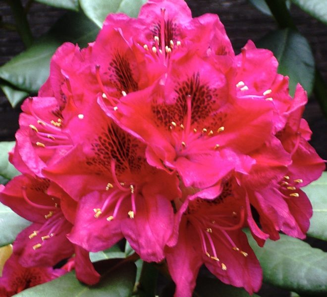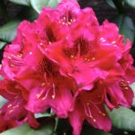 Пышное и декоративное цветение рододендрона в большинстве регионов происходит в май-июнь. Цветки у растения рубиново-красные и выглядят декоративно благодаря черному крапу на верхнем лепестке. Рубиновые цветки почти не источают аромат, собраны в соцветия по 10 штук. Если в конце весны цветение очень эффектно, то в остальное время культура порадует садоводов красотой глянцевых вечнозеленых листьев с бледной «подкладкой».