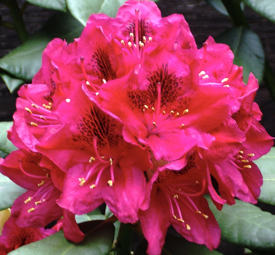 Пышное и декоративное цветение рододендрона в большинстве регионов происходит в май-июнь. Цветки у растения рубиново-красные и выглядят декоративно благодаря черному крапу на верхнем лепестке. Рубиновые цветки почти не источают аромат, собраны в соцветия по 10 штук. Если в конце весны цветение очень эффектно, то в остальное время культура порадует садоводов красотой глянцевых вечнозеленых листьев с бледной «подкладкой».