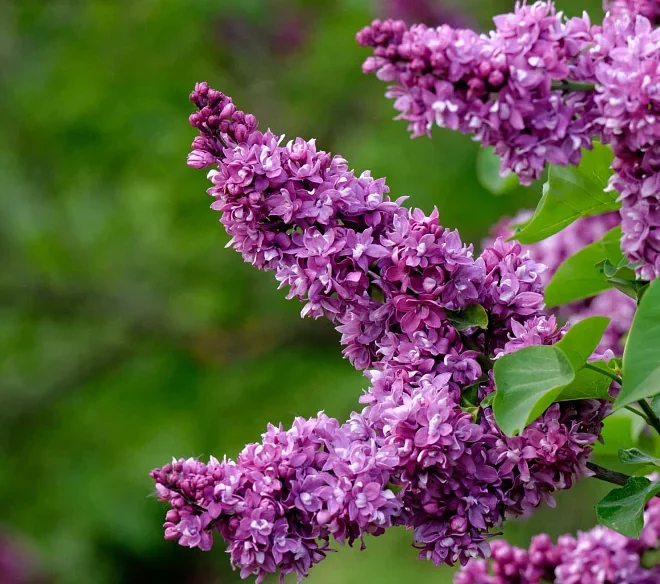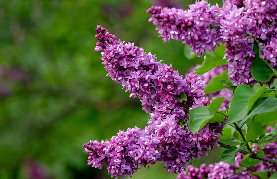 Весной листовые и цветочные почки набухают рано. Листья распускаются с теплой погодой, не опадают до заморозков. Благодаря красивой, сердцевидной форме листьев, расположенных супротивно, и насыщенному цвету темной зелени, сирень декоративна весь летне-осенний сезон. Длина листовой пластинки до 8-10 см, ширина 4-6 см, верхушка заостренная.
