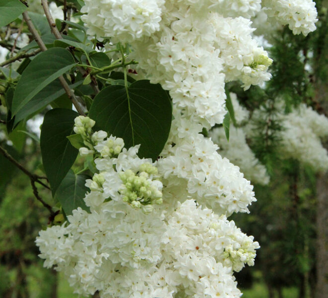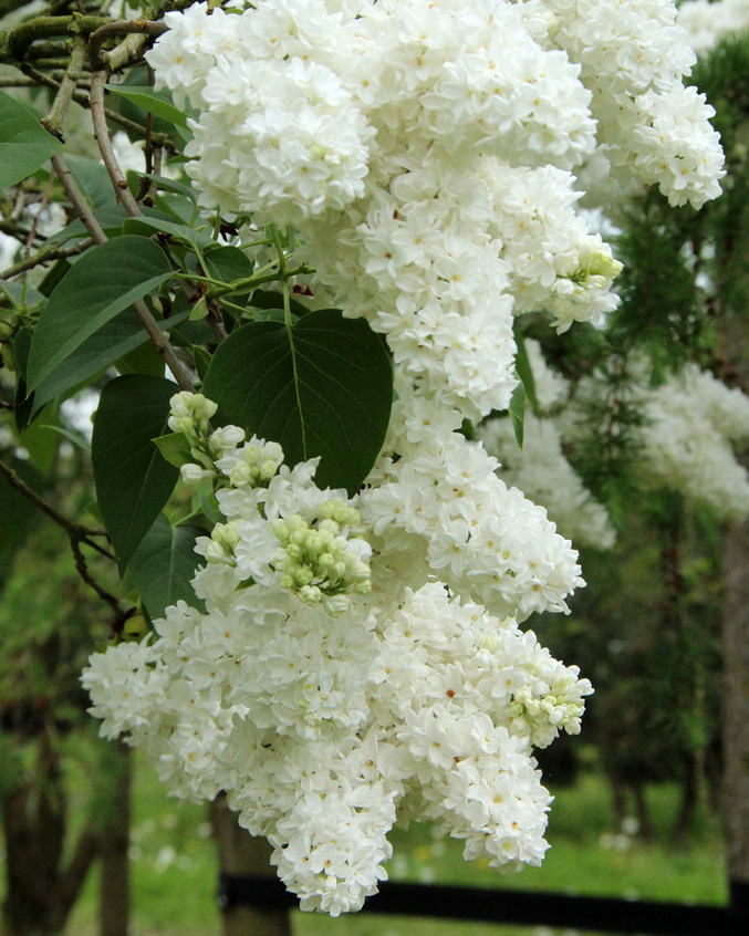 Еще одно излюбленное сочетание дизайнеров — сирень и хвойные кустарники. На фоне хвои ярко-белые соцветия смотрятся особенно красиво.