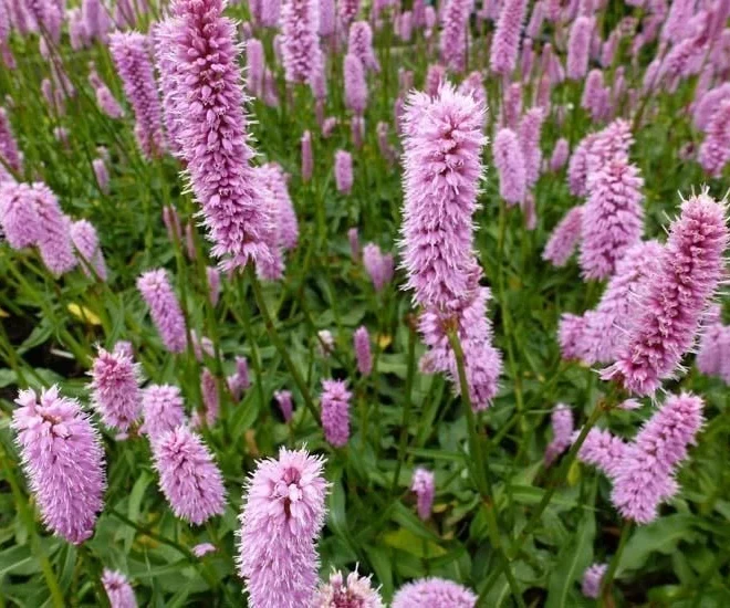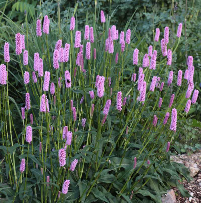 Надежный сорт- Горец змеиный `Hohe Tatra`- декоративен в течение всего сезона. Куст компактный, высотой во время цветения до 80 см, диаметр около 40 см. Листья крупные, широколанцетные, темно-зеленые со светлой центральной жилкой, гладкие, собраны в прикорневую розетку.Цветет в мае-июле. Цветки мелкие, кораллово-розовые, собраны в колосовидное соцветие.