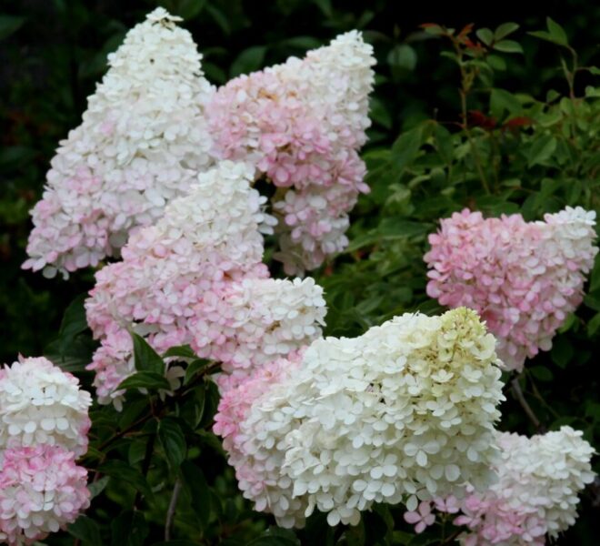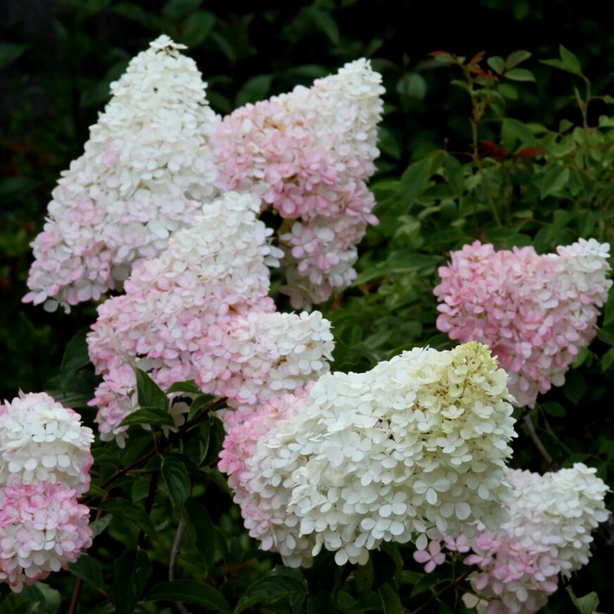 Новинка 2019 года.Компактный куст высотой не более 0,6-0,8 м и диаметром 0,6-0,7 м. Побеги яркие, красно-коричневого цвета, прочные, жесткие, отлично удерживают пышные шапки соцветий и во время цветения не разваливаются. Листья темно-зеленые, с красивым дуговидным жилкованием и мелкозубчатым краем. Соцветия – крупные метелки пирамидальной формы со слегка заостренной вершиной, состоят из стерильных цветков, расположенных в кисти густым каскадом. Вначале ослепительно белые и кремовые, к концу цветения приобретают легкие розоватые оттенки, в основном в нижней части соцветия. Цветение с июля по сентябрь.