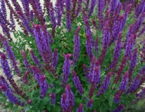 Саженцы шалфея дубравного являются самыми долговечными и стойкими к зимним морозам растениями вида сальвии. Их соцветия напоминают колосья и имеют не особо крупные цветки фиолетового цвета, от которых исходит приятный аромат пряностей. Они долго сохраняют свой внешний вид, благодаря чему ими можно украсить любой участок.