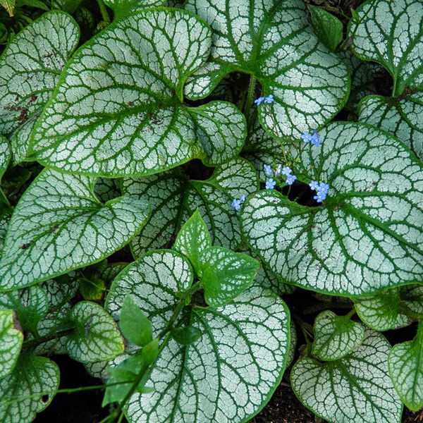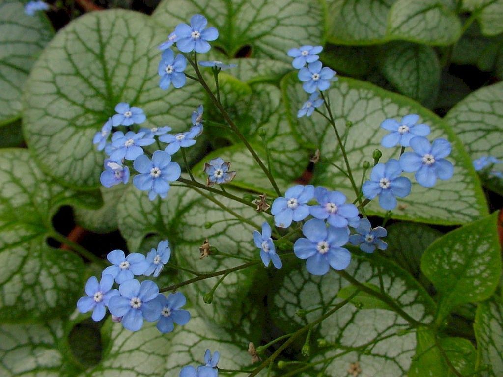 Бруннера крупнолистная Джек Фрост. Бруннера крупнолистная: растет в виде раскидистого кустика, от толстого и длинного корневища которого отходят несколько разветвленных стеблей до 40 см. Листья продолговатые, прикорневые на длинных черешках, сердцевидные с острой верхушкой, сверху темно-зеленые, снизу сероватые и шершавые от опушения, до 25 см длиной. Цветки до 0,7 см в диаметре, в верхушечных, метельчато-щитковидных соцветиях, темно-голубые с белым пятном в центре, внешне похожие на цветки незабудки. Цветение начинается в конце апреля — начале мая и длится около месяца. Теплой, продолжительной осенью может цвести вторично. Джек Фрост: высота 40 см. Имеет практически серебристые листья, зелеными остаются лишь жилки и узкая полоска по краю листа. Мелкие голубые цветы появляются в мае. Месторасположение: полутень, в полной тени растения вытягиваются, теряют декоративность. Почва: умеренно влажные почвы. Использование: в бордюрах, так как она не разрастается, держит форму весь сезон, листья ее аккуратны. Ее можно использовать и для посадки в тенистых рокариях, но в их наиболее увлажненной части