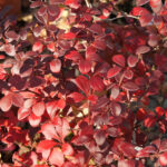 - Листья: небольшие, размером до 3 см, темно-пурпурного цвета летом, и красного — осенью.