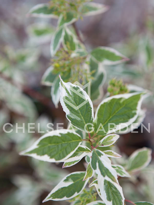 Кустарник декоративный, обладает объемной кроной, которая во взрослом виде достигает 2 метров в диаметре. Листопадный кустарник вырастает до 1,5-2 метра. Тонкие декоративные побеги кустарника растут вертикально, с течением времени дают корневую поросль, которая стелется по земле. Стебли весной ярко-красного цвета. Листья кустарника достаточно крупные, плоской формы, весной и летом — темно-зеленого цвета, имеют окантовку белого или кремового цвета, пятна и полосы. Осенью листья меняют цвет и становятся красноватого или фиолетового оттенка. При этом кайма сохраняет свой цвет. Листья заостренные, немного морщинистые, складчатые. Крона раскидистая.