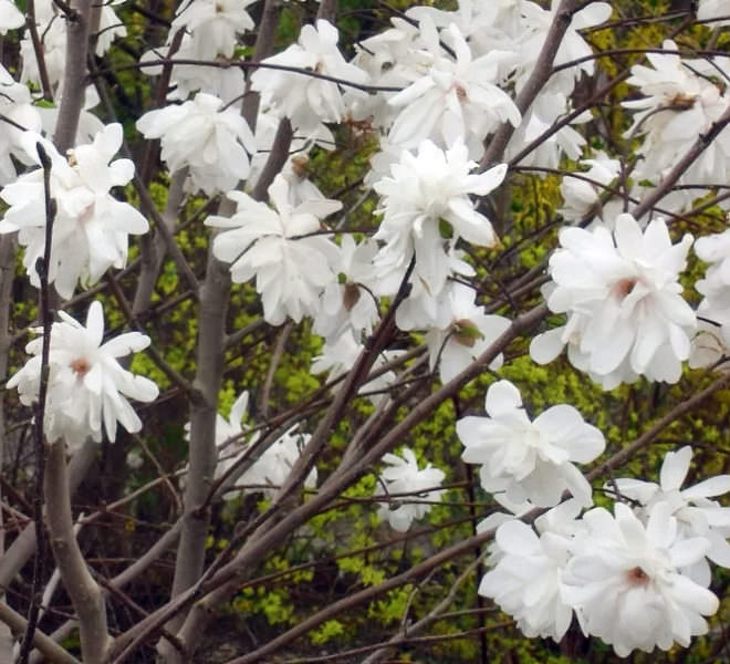 На территории загородного участка магнолия в ландшафте будет превосходно смотреться в любое время года: ветки дерева в зимнее время создают оригинальный узор на фоне неба. Весной цветение растения белыми оттенками в сочетании с сочными зелеными листьями придает саду нежность и неповторимое очарование.