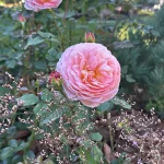 Цветок с уникальной игрой цвета — медно-абрикосовый в центре, переходящий к краям в нежно-розовый, очень крупный, густомахровый, диаметром 12–15 см, с 70–140 лепестками. Форма чашевидная, розетковидная, старинная. Обладает очень сильным, насыщенным фруктовым ароматом с ярко выраженными нотами клубники, розового масла и цитрусовых. Цветки появляются одиночно или собраны в небольшие кисти по 2–3 штуки.