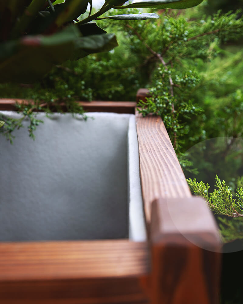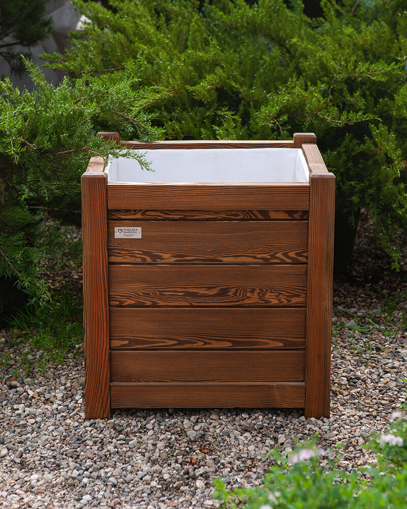 Модель кашпо напольного уличного отлично подойдёт оформления интерьера и ландшафта, а помимо использования натуральной породы дерева, для изготовления кашпо была использована устойчивая конструкция – алюминиевый каркас, а также утеплитель.