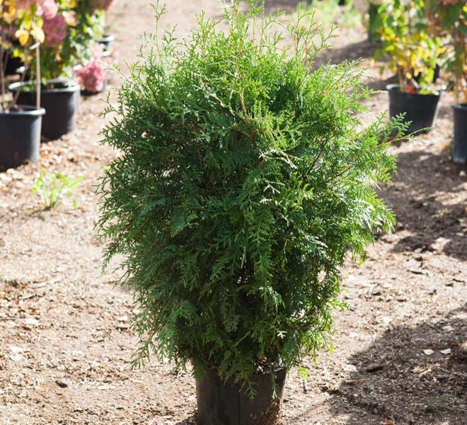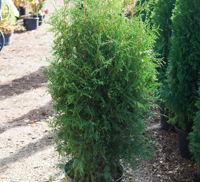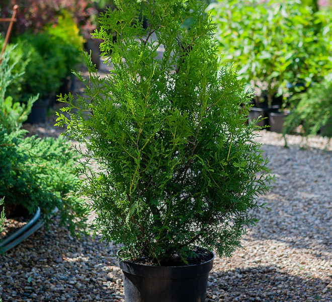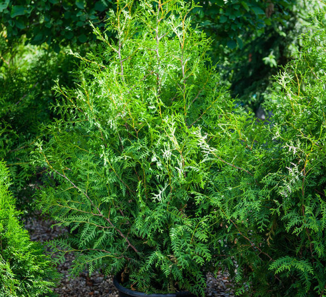 Туя отлично подходит для создания живых изгородей, а также ландшафтных композиций вместе с другими вечнозелеными растениями и кустарниками по индивидуальному проекту.