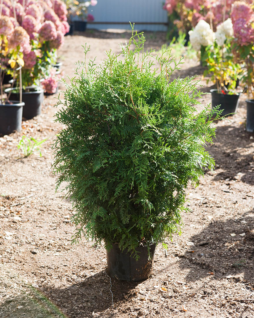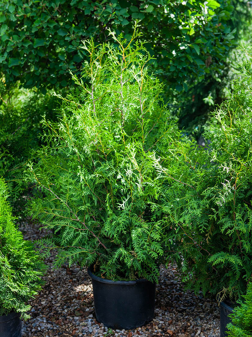 Туя отлично подходит для создания живых изгородей, а также ландшафтных композиций вместе с другими вечнозелеными растениями и кустарниками по индивидуальному проекту.