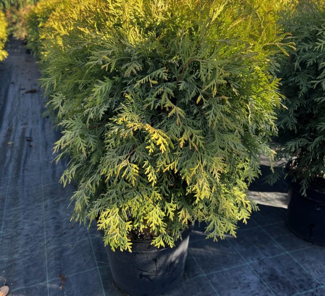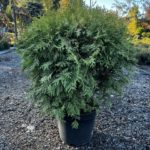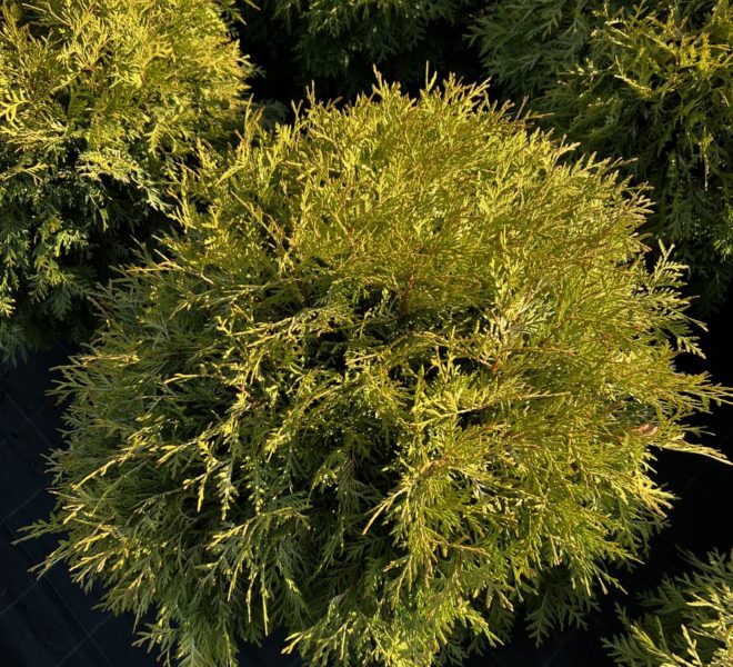 Растение среднерослое, около 120 см высотой и 100 см диаметром, имеет плотную крону шаровидной или яйцевидной формы и плоские прямые побеги, которые поднимаются вверх. Культура медленно растёт, годовой прирост в ширину составляет около 4 см, в высоту – 5 см. На побегах располагается чешуйчатая мягкая хвоя салатового оттенка, в осенне-зимний период она становится коричневой.