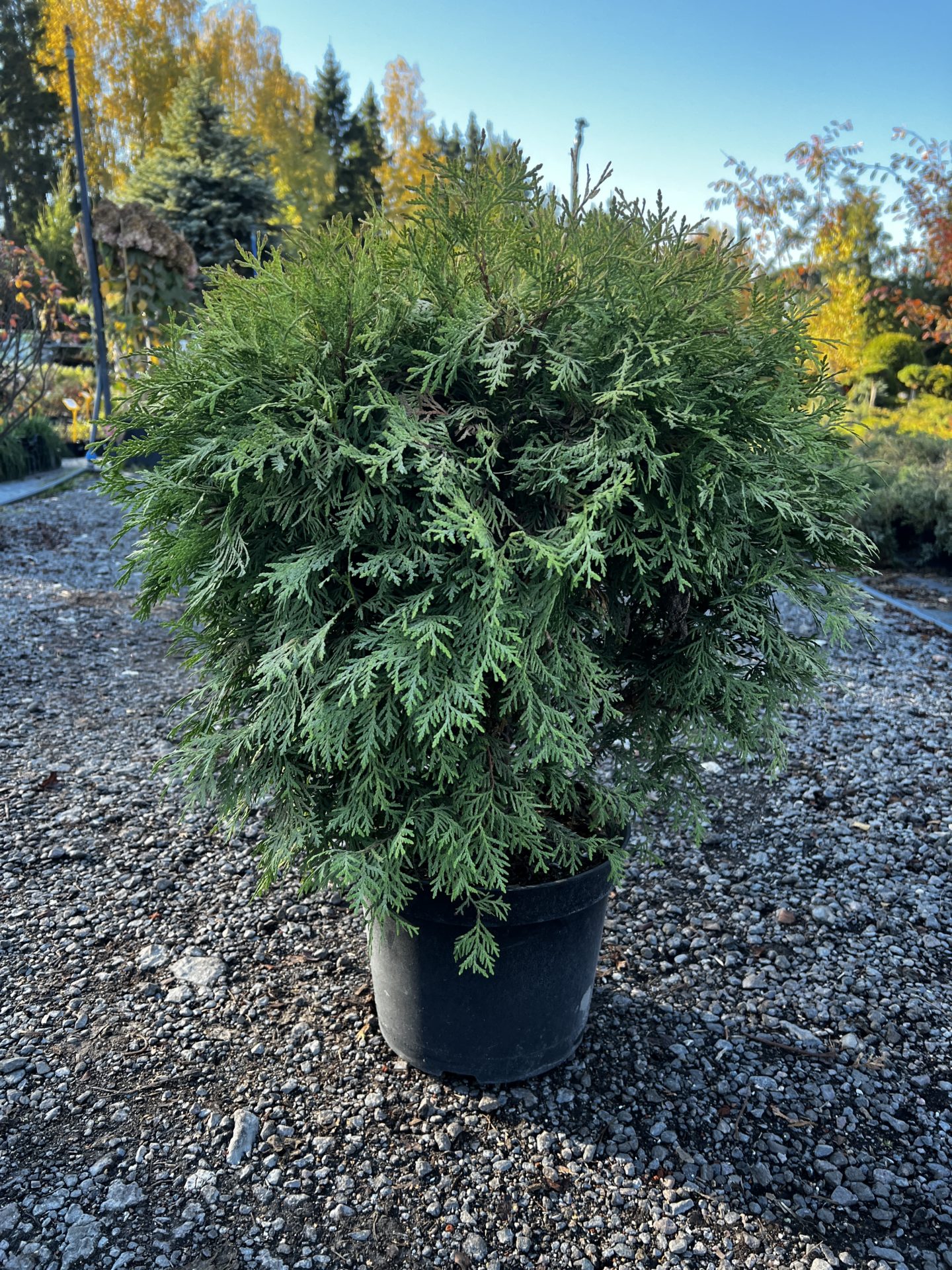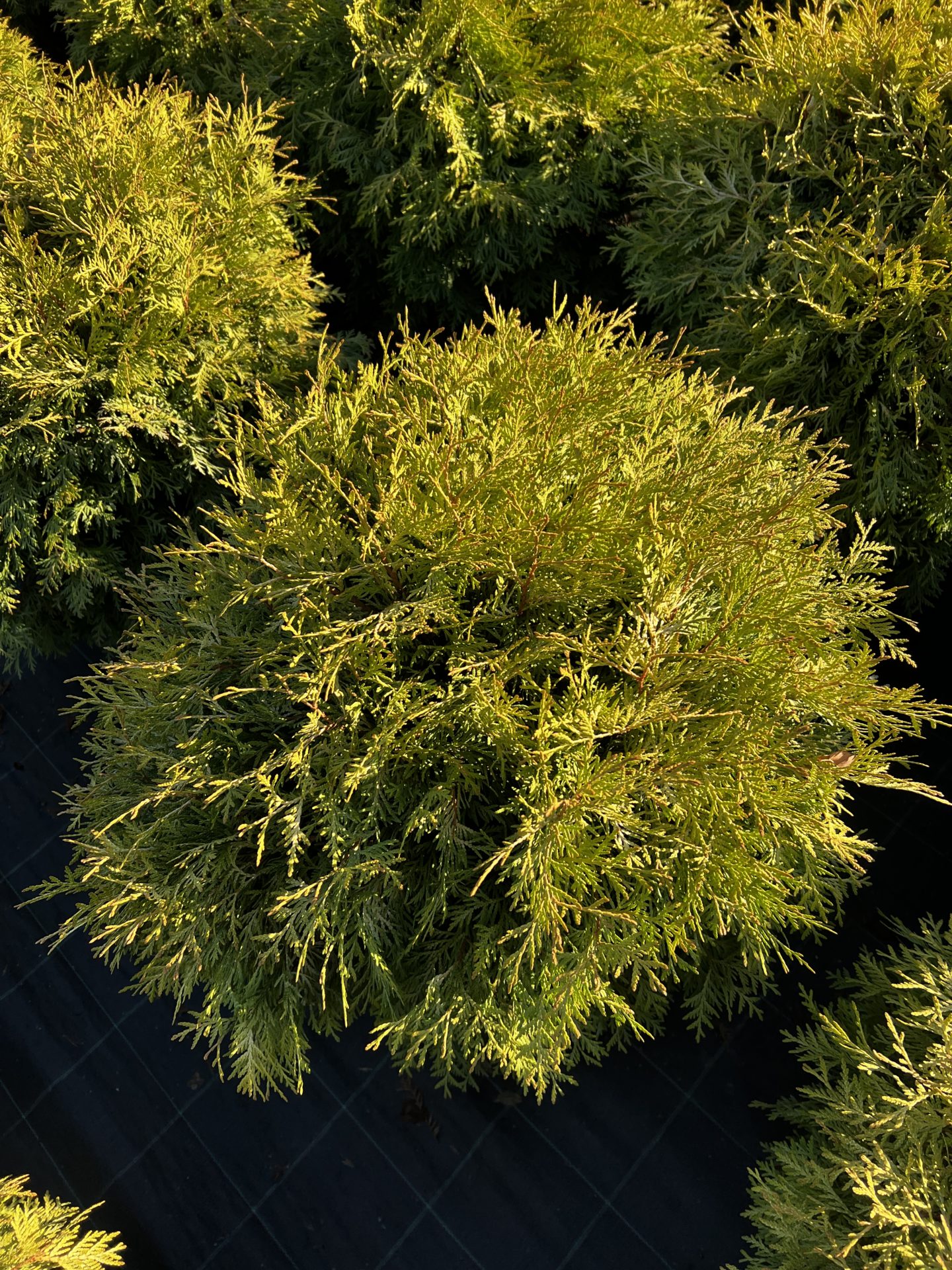 Растение среднерослое, около 120 см высотой и 100 см диаметром, имеет плотную крону шаровидной или яйцевидной формы и плоские прямые побеги, которые поднимаются вверх. Культура медленно растёт, годовой прирост в ширину составляет около 4 см, в высоту – 5 см. На побегах располагается чешуйчатая мягкая хвоя салатового оттенка, в осенне-зимний период она становится коричневой.