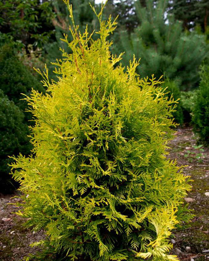 Туя западная Aurescens — это растение с великолепными золотисто-желтыми оттенками, которые выделят ваш сад среди остальных. Ее плотные иглы и пирамидальная форма создают эффектное сочетание изящества и стойкости. Этот сорт туи идеально подходит для создания живых изгородей, садовых композиций или одиночных посадок.