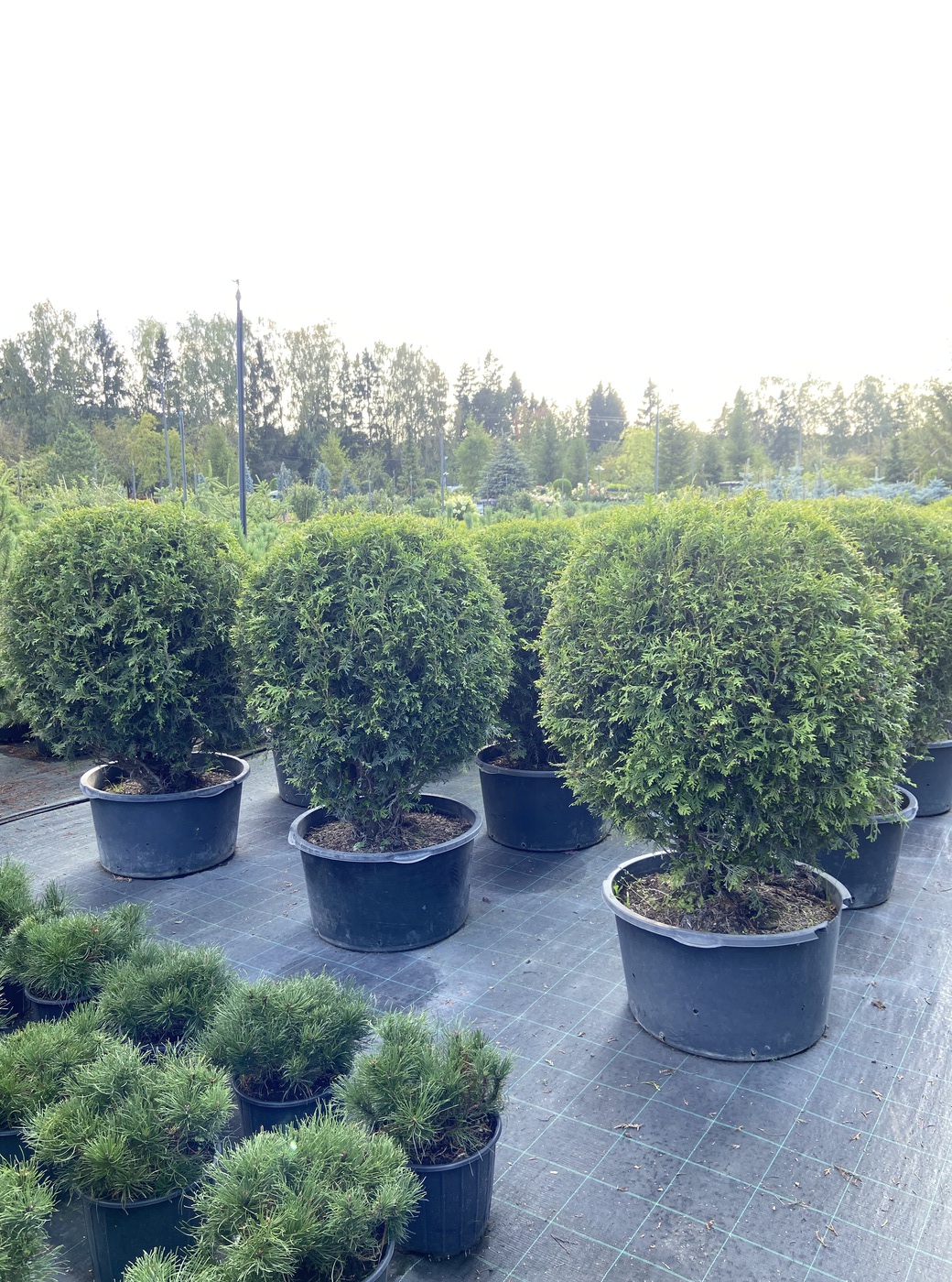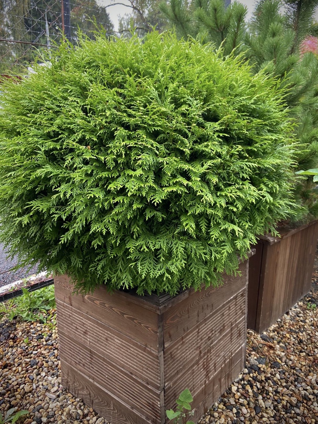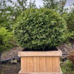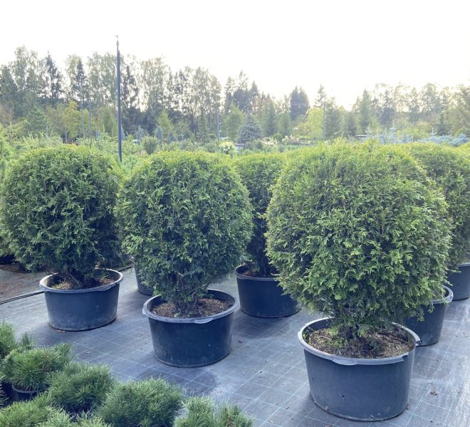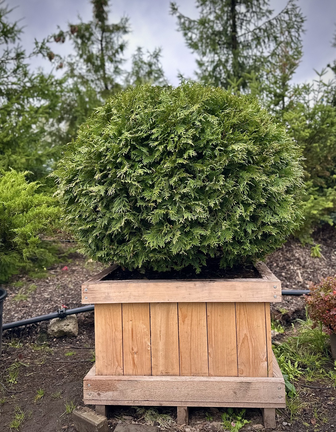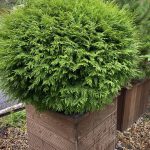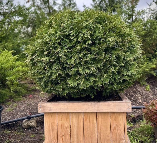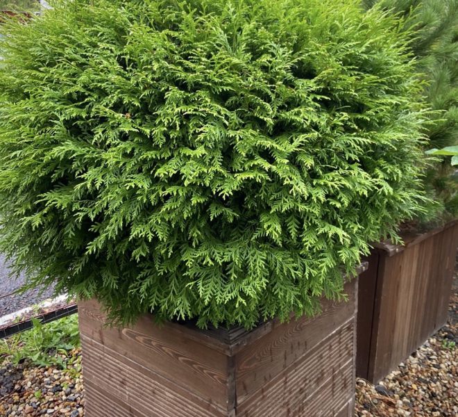 Туя Вудварди шаровидная — Этот сорт чрезвычайно популярен в Европе, в первую очередь, из-за своих декоративных свойств: насыщенного зеленого цвета, плотной формы кроны, красивого габитуса, отличной приживаемости и неприхотливости. Крона шаровидная, позднее становится более широкой, вырастает в высоту до 1,5 метров в 10 лет. Позднее крона становится более широкой, до 3м в диаметре, при 2,0-2,5м высоты. Одна из немногих туй, которая обладает округло яйцевидной формой кроны и достаточным ростом, чтобы выступать в качестве солирующего растения в композициях. Побеги густые, прямые , плоские. Хвоя от темно-зеленой до светло-зеленой.