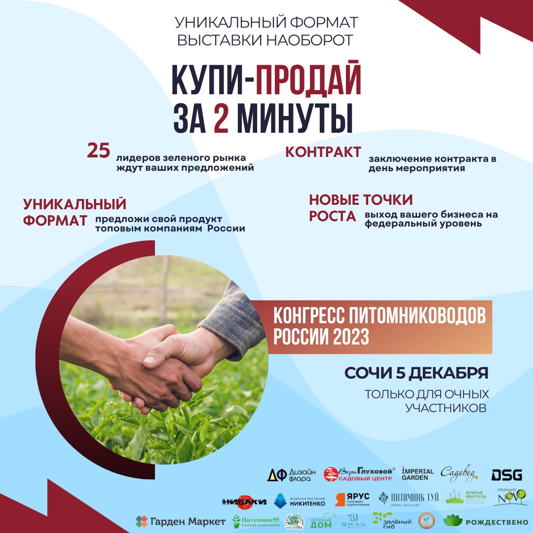 На сессии вы сможете предложить свой товар или услугу в режиме реального времени крупнейшим участникам зеленого рынка — питомникам и садовым центрам России.