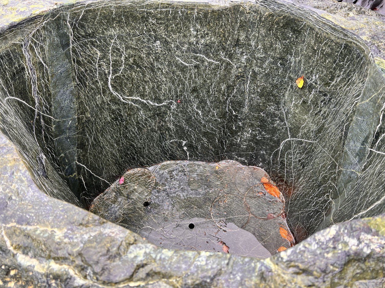 Выбор пал на камень змеевик бирюзовый, вес которого до обработки составлял 3,46 тонны. Камень обладает высокой декоративностью, имеет бирюзовый оттенок. В глыбе было просверлено 14 погонных метров каменного массива диаметром 150мм. Вес изделия после обработки составляет 2810 кг.