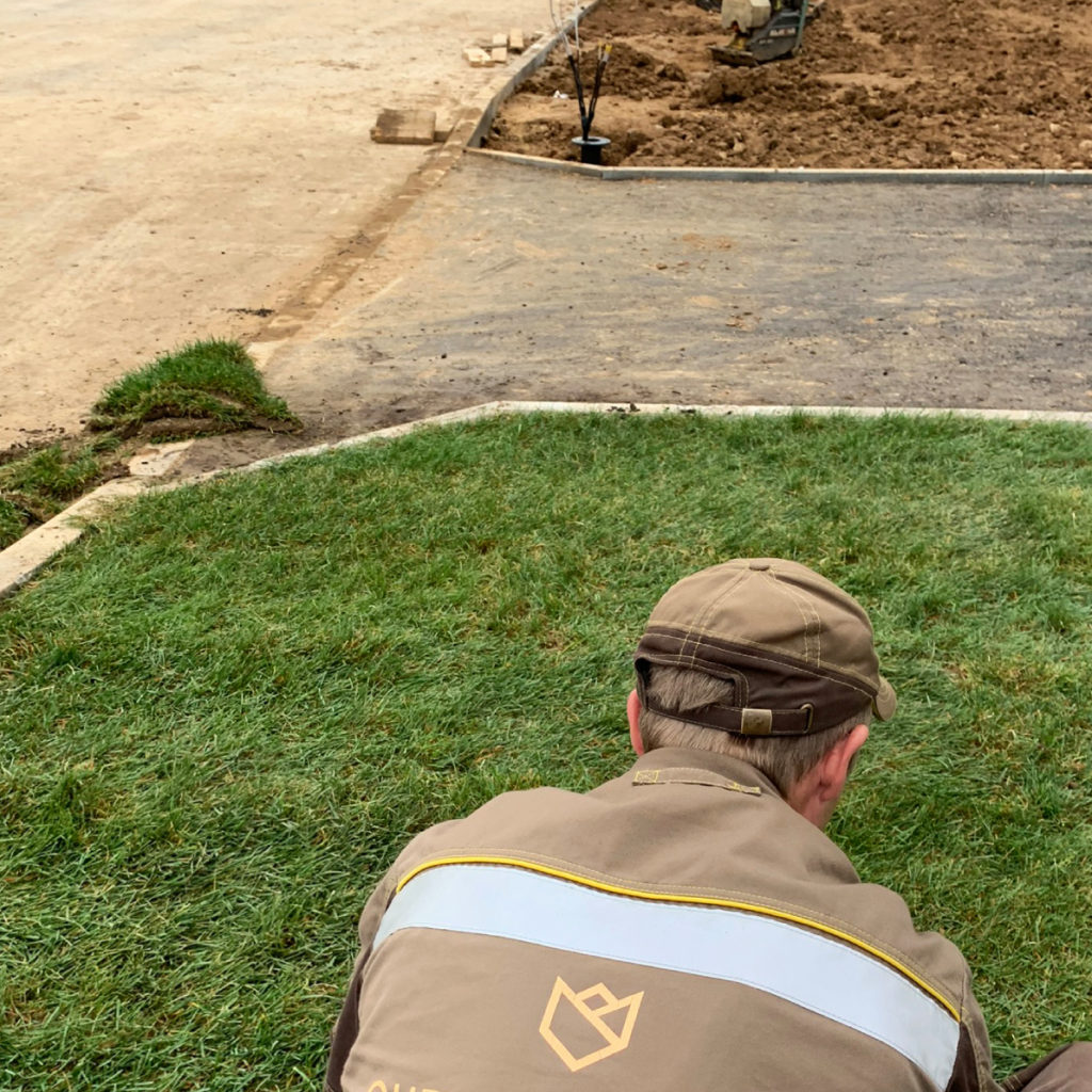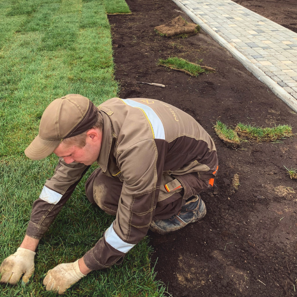 Процесс укладки газона, с выравниванием выступов и уплотнением почвы